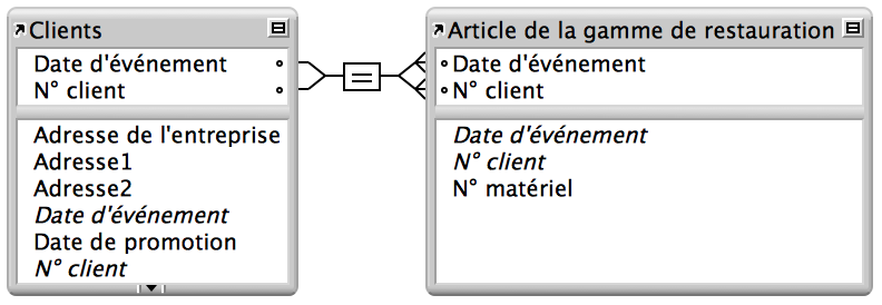 Rubrique Nombre, numéro de série entré automatiquement ; l'une des rubriques sources de la table Articles de la gamme de restauration Dans la boîte de dialogue Modifier le lien, la case à cocher Permettre la création d'enregistrements dans cette table via ce lien est activée pour la table Articles de la gamme de restauration. Ceci signifie que vous pouvez entrer des informations de location dans une rangée de table externe vide et que FileMaker Pro crée un enregistrement lié pour cette location.Enfin, une table externe est ajoutée à la table Articles de la gamme de restauration sur le modèle Clients.