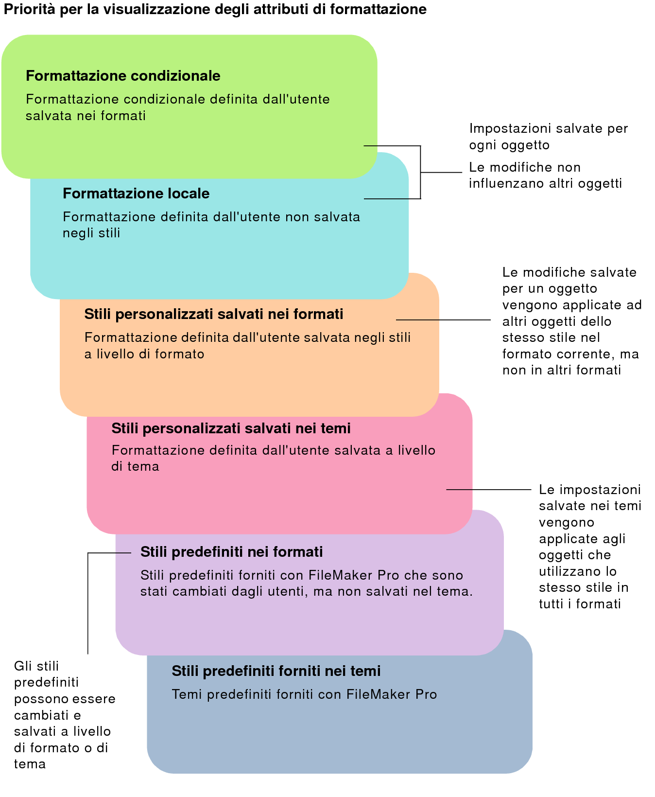 Modalità di visualizzazione degli attributi di formattazione in FileMaker ProQuando si modificano gli attributi di visualizzazione di oggetti, sezioni o sfondo del formato, FileMaker Pro visualizza le formattazioni secondo una gerarchia, o un ordine di precedenza, definiti. Un fattore che determina la visualizzazione degli attributi di formattazione è il salvataggio delle modifiche a livello di formato o di tema. La figura di seguito mostra l'ordine di precedenza in base al quale vengono visualizzate le modifiche di formattazione.