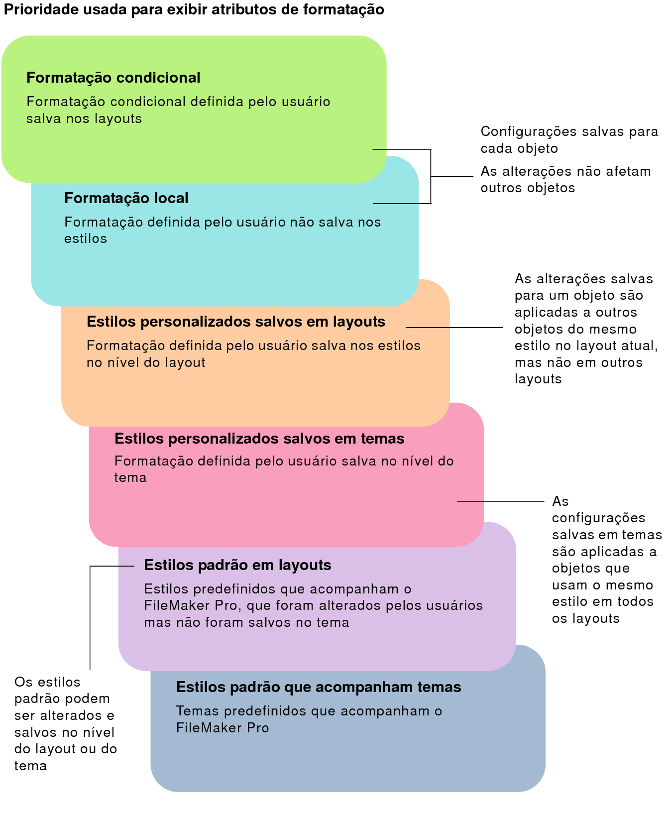 Como o FileMaker Pro exibe atributos de formataçãoQuando você altera os atributos de exibição de objetos, partes de layout ou plano de fundo de layout, o FileMaker Pro exibe os formatos de acordo com uma hierarquia definida ou uma precedência. Um fator que determina se os atributos de formatação são exibidos é quando você salva as alterações no nível do layout ou no nível do tema. A ilustração a seguir mostra a ordem de precedência em que as alterações de formatação são exibidas.