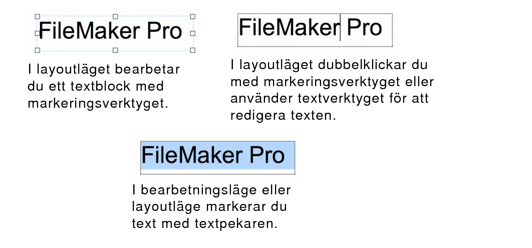 • I Layoutläge använder du Textverktygetför att redigera text. Du kan också dubbelklicka på ett textblock med markeringsverktyget för att redigera texten.